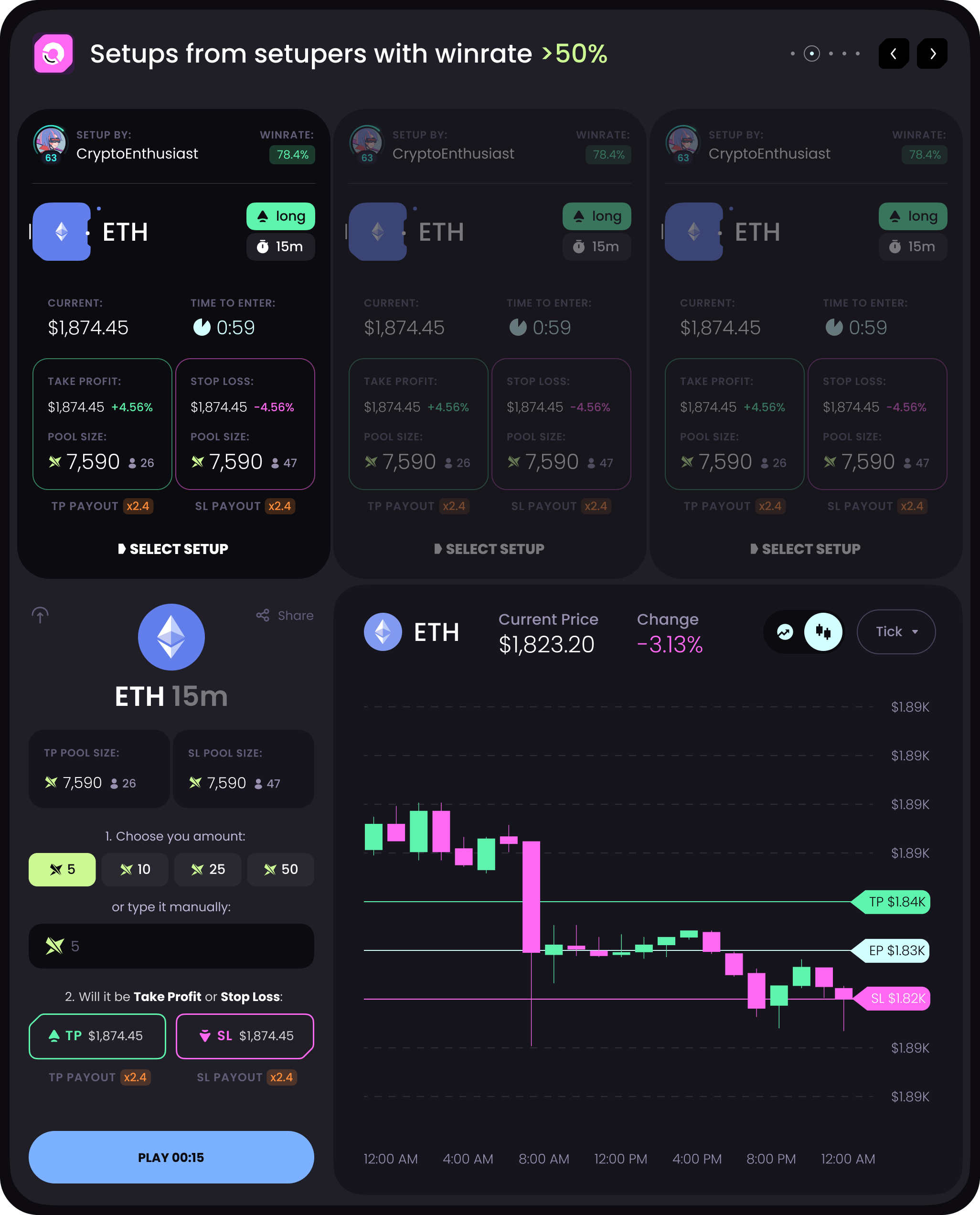 A trader posts the following idea: Long ETH at $3,000, TP $3,100, SL $2,950, duration 24 hours. There are $5000 worth of bids in the TP pool and $10000 in the SL pool (most users think the trader is wrong), so the current multiplier is 2. Bob, however, is certain that the price will go up, so he places $50 in the TP pool. With the 2x multiplier, he stands to win almost $100 (minus the 5% deducted in favor of the author of the setup and the 5% platform fee). &#x20;
